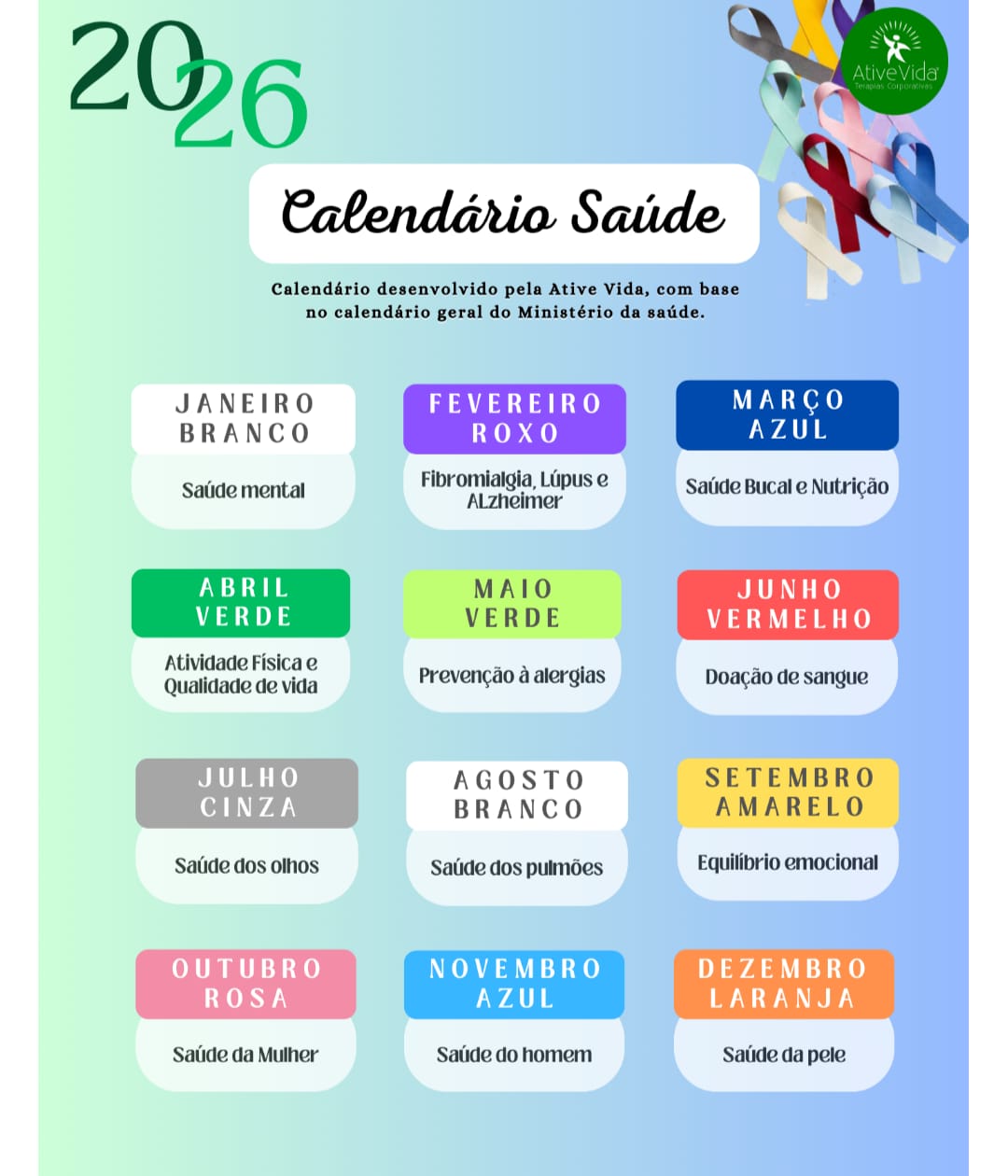 Pegamos "emprestado" este calendário da ATIVE VIDA, para elencar que todo mês, há uma campanha, visando conscientizar e trabalhar preventivamente para as desafiadoras doenças existentes, com intuito de que possamos organizar nossas rotinas e buscar ajuda nas atividades e opções mais naturais visando burlá-las.